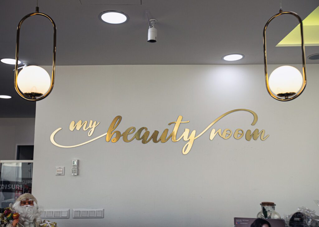 Elegantes Innenschild mit goldenen metallischen Buchstaben für My Beauty Room.