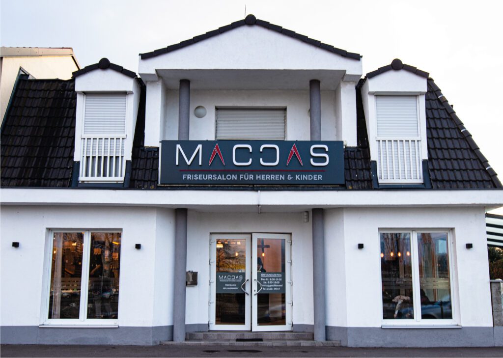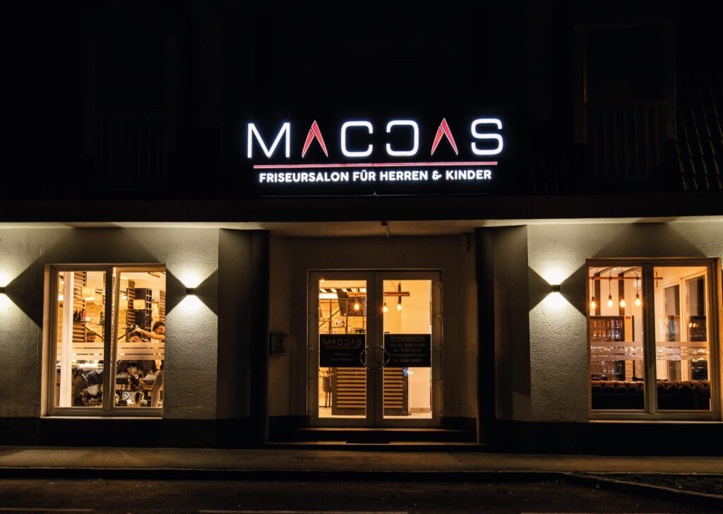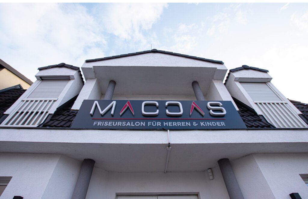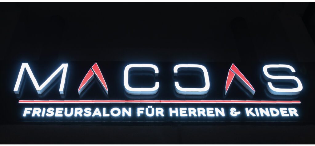 Modernes Außenschild für Maccas mit dunkelblauem Hintergrund und weißen sowie roten Buchstaben.