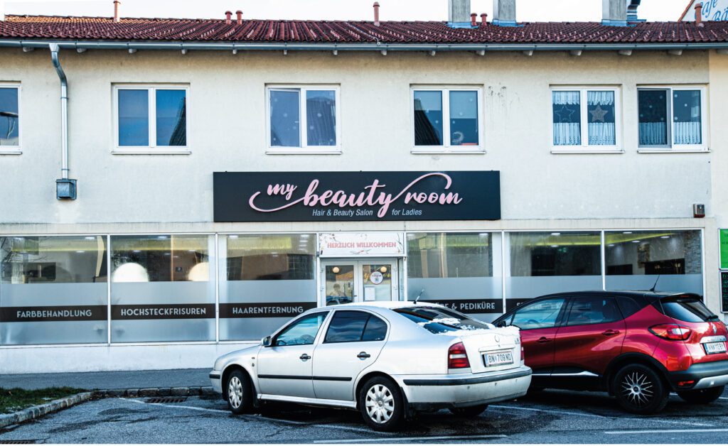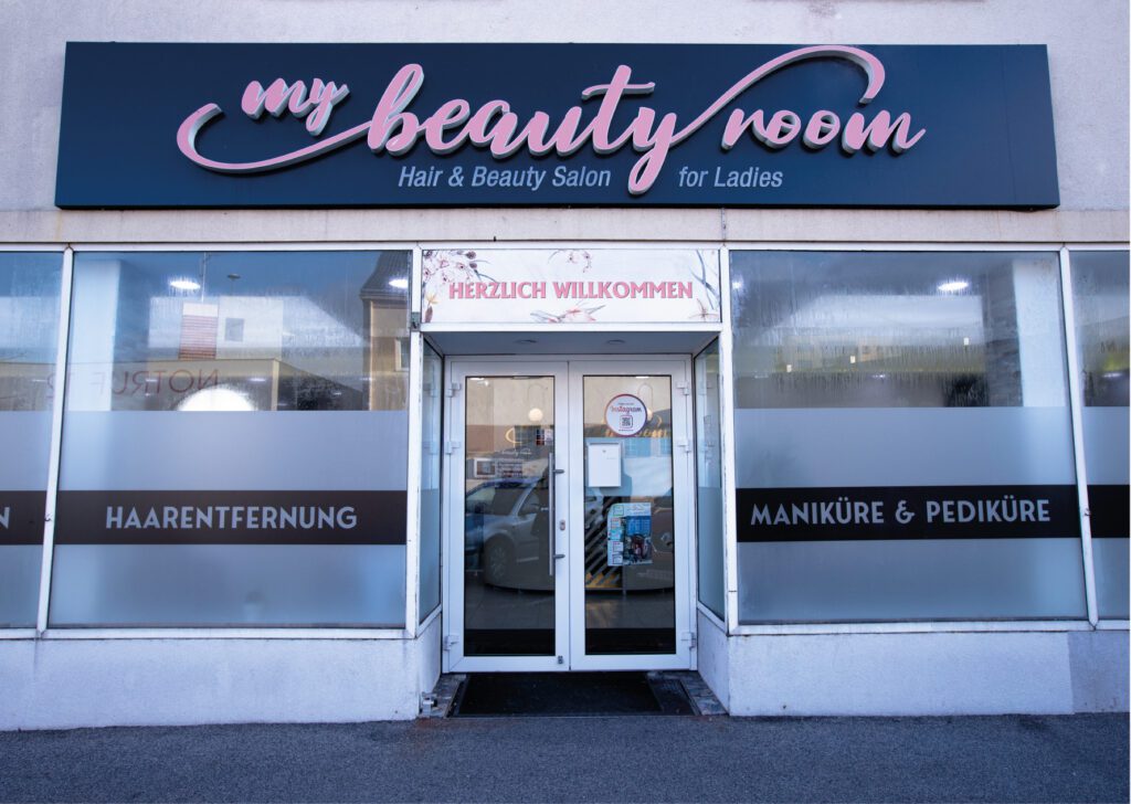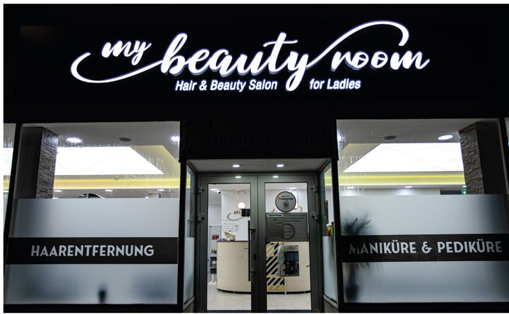 Elegantes Außenschild für My Beauty Room mit schwarzem Hintergrund und rosa sowie weißen Reliefbuchstaben.