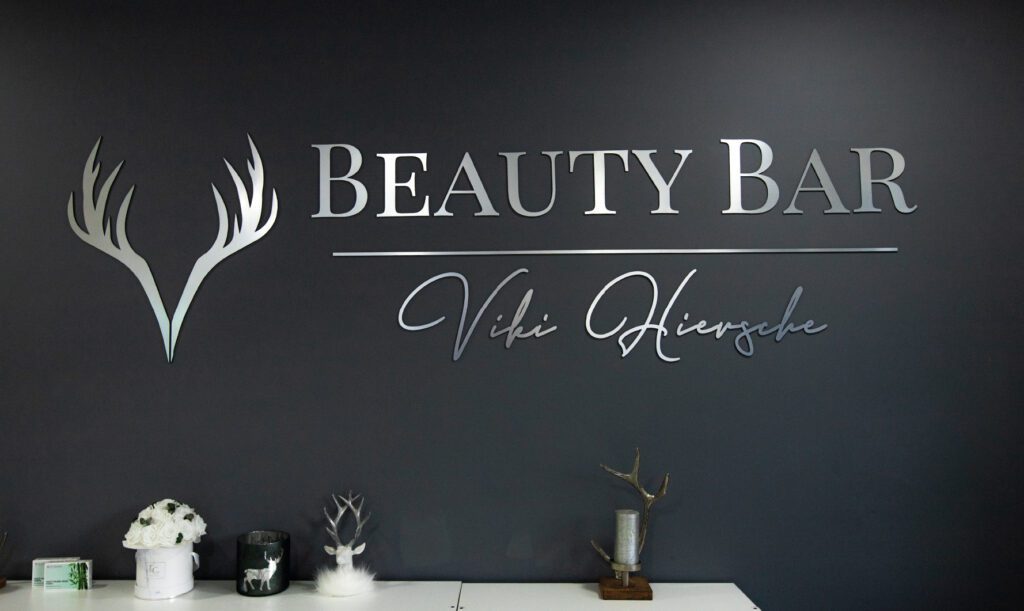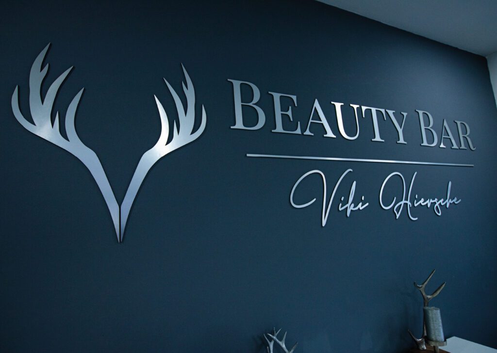 Elegantes Schild mit metallischen Acrylbuchstaben und Logo auf schwarzer Wand für Beauty Bar by Viki Hiersche.