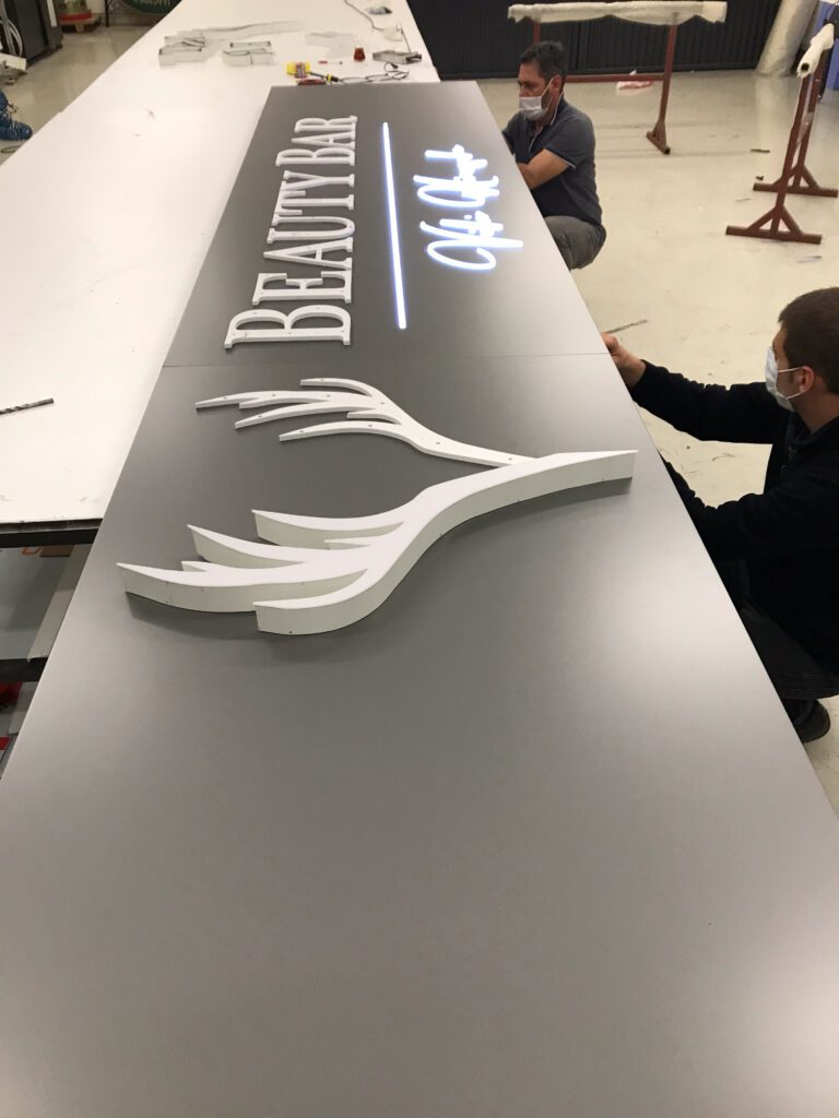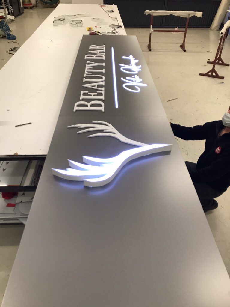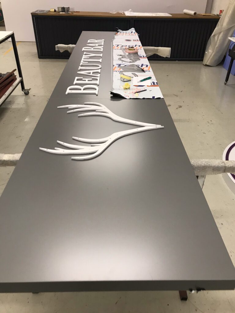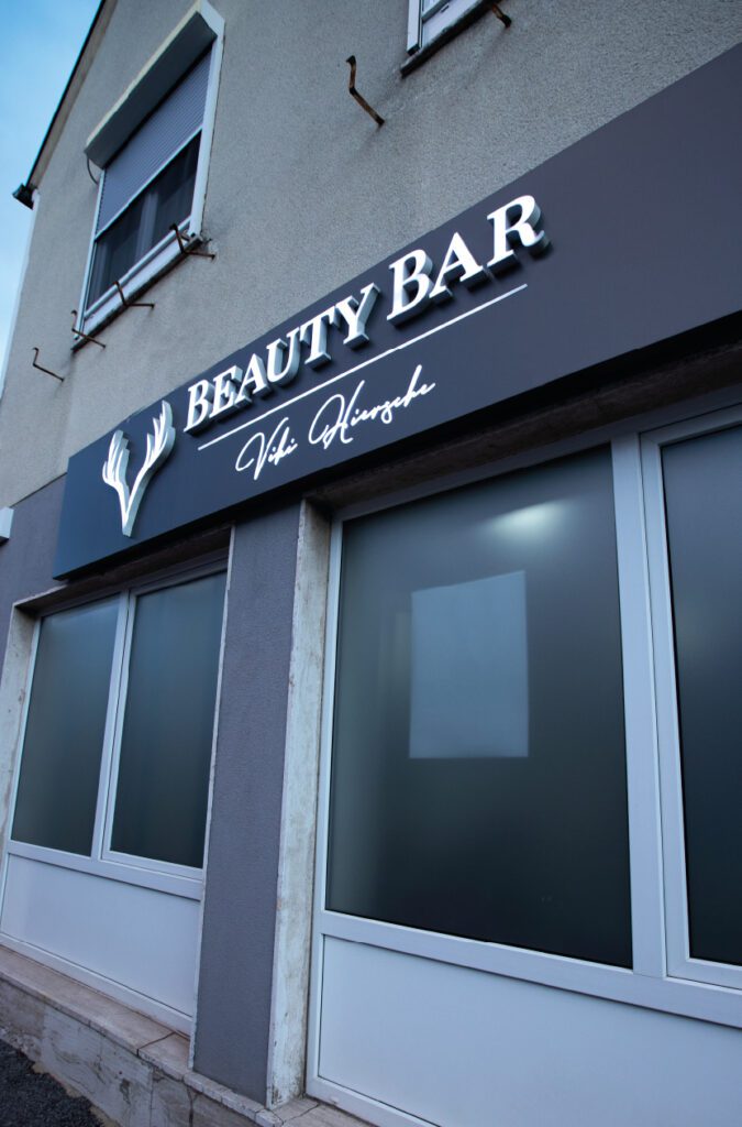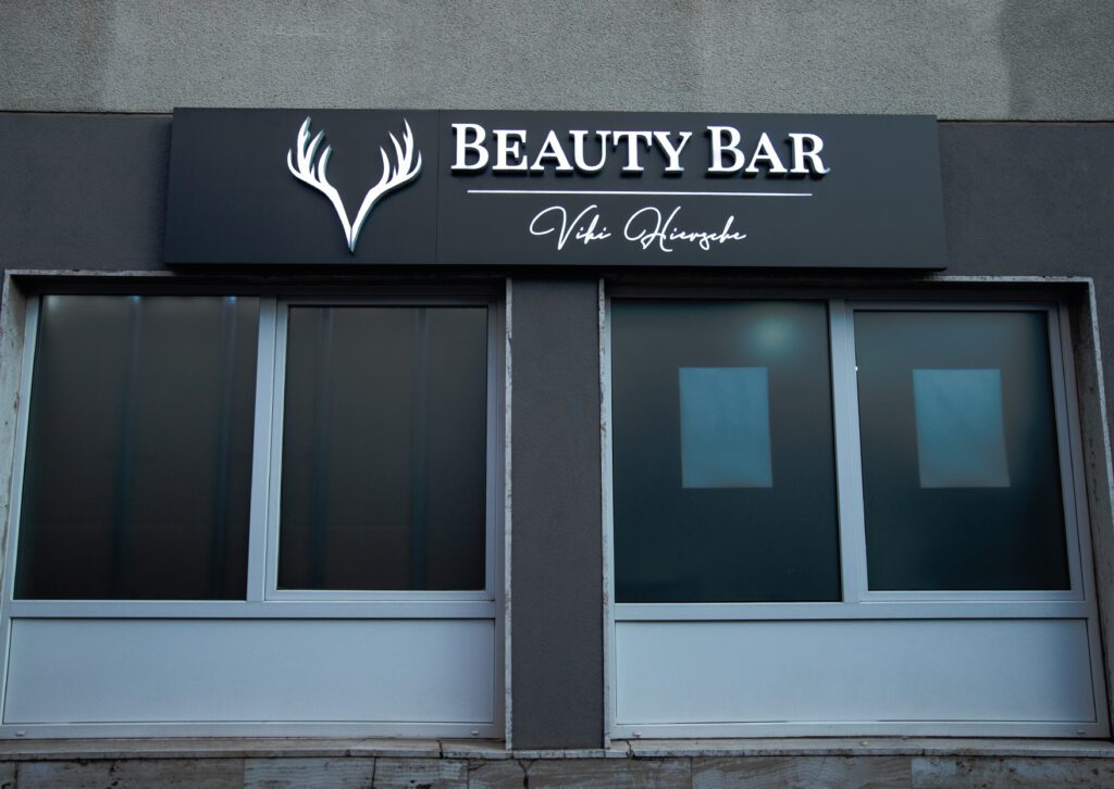 Modernes und elegantes schwarzes Schild mit weißen Acrylbuchstaben für Beauty Bar by Viki Hiersche.