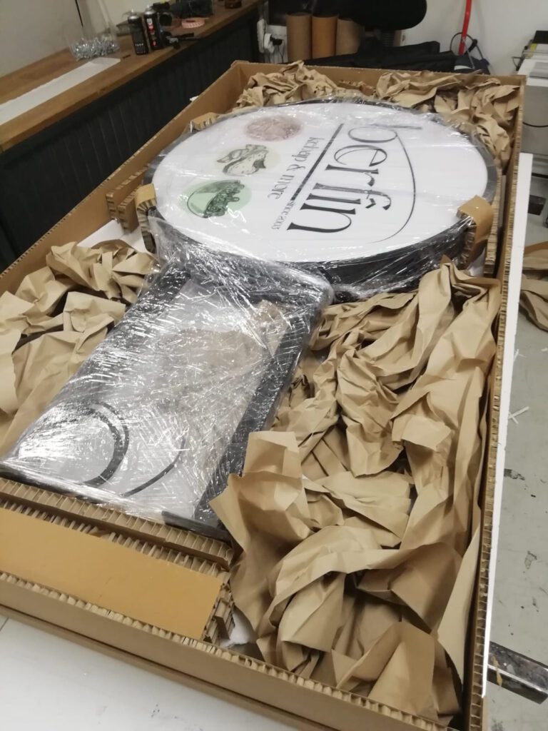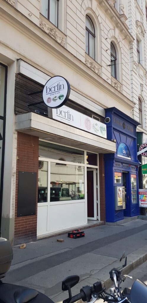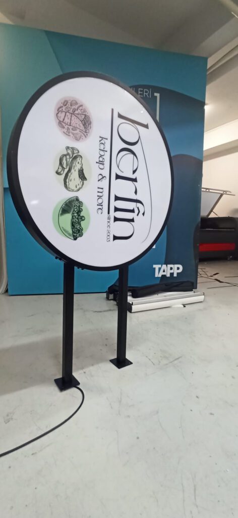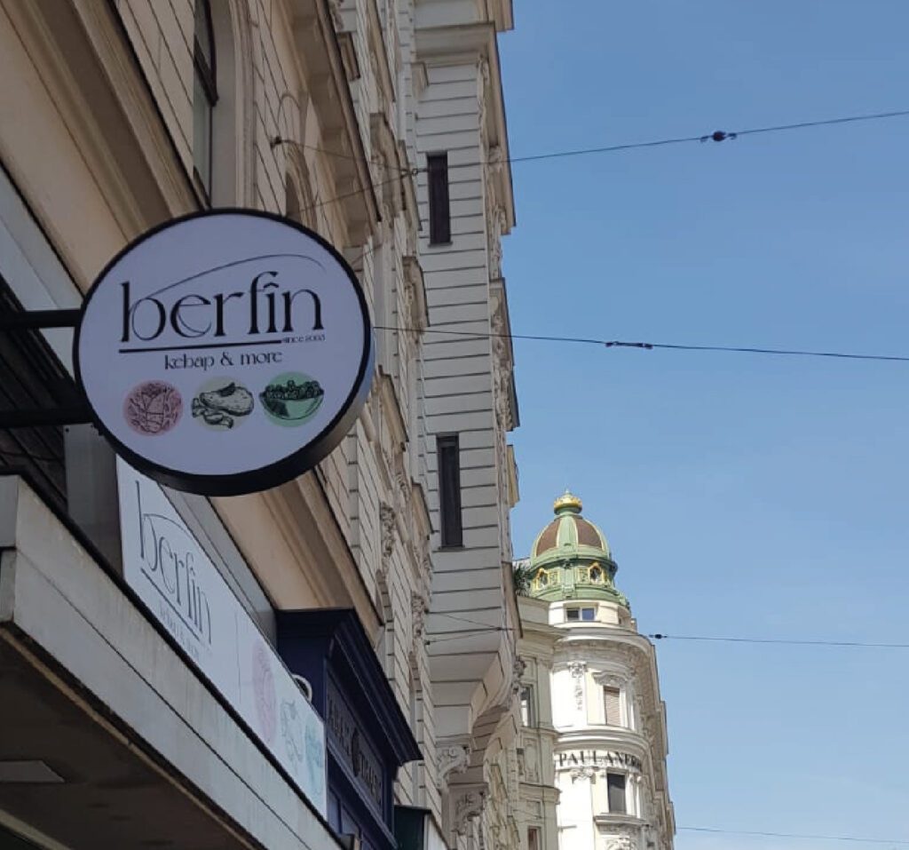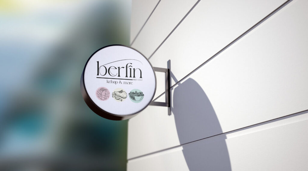 Elegantes rundes Schild für Berfin Kebab & More. Schwarzer Rahmen mit weißem Hintergrund und moderner Schriftgestaltung.